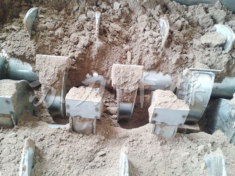 ??污泥由給料機經溜槽進入烘干機內導料板上,隨著筒體的轉動,污泥被導至傾斜揚料板上即被提升到筒體的中心位置,逐漸灑落形成料幕,高溫氣流從中穿過,使污泥預熱并蒸發部分水分。當污泥灑落、移動到活動的篦條式翼板上時,物料又與預熱過的篦條式翼板夾雜在一起,將熱量傳給物料,使部分水分蒸發。同時,翼板夾帶物料提起、灑落,重復多次,物料與熱氣流進行對流和接觸熱交換。同時埋在物料中的清掃裝置,也沿圓弧形揚料板的里側下滑,把揚料板內壁粘附的物料清掃下來。當清掃裝置隨筒體轉過垂直線以后,又在圓弧揚料板背面拖動,將其粘附在揚料板外壁的物料清掃下來。隨著筒體的不斷轉動,使部分水分蒸發,污泥得到進一步干燥。同時,清掃裝置對污泥團球也起到了打碎作用,提高了干燥速度,后污泥干燥后變成低水分的松散物料,由出料口排出。
